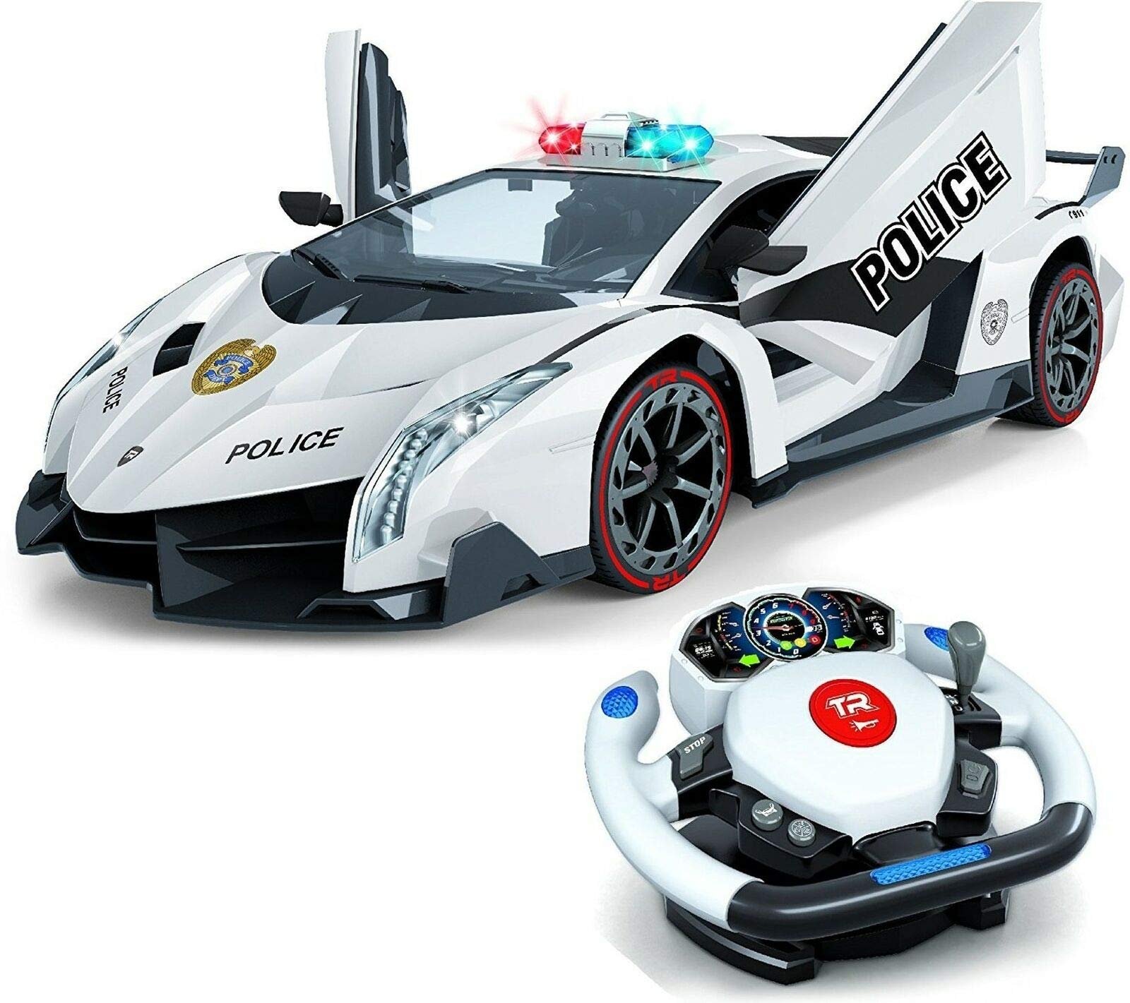 Voiture de police RC télécommandée Top Race TR-911, contrôle de la gravité et du volant de mouvement 4D, échelle 1 : 12, 2,4 GHz, avec lumières, sirènes, portes motorisées, jouets, voitures jouets